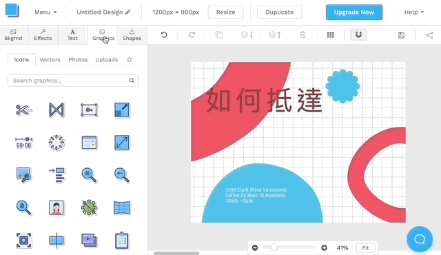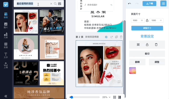 主打簡單、快速的線上工具,內建圖庫、簡易向量圖,也預設有數個平台畫布尺寸,一件即可切換,物件不會消失,對需要跨平台的小編來說相當方便。