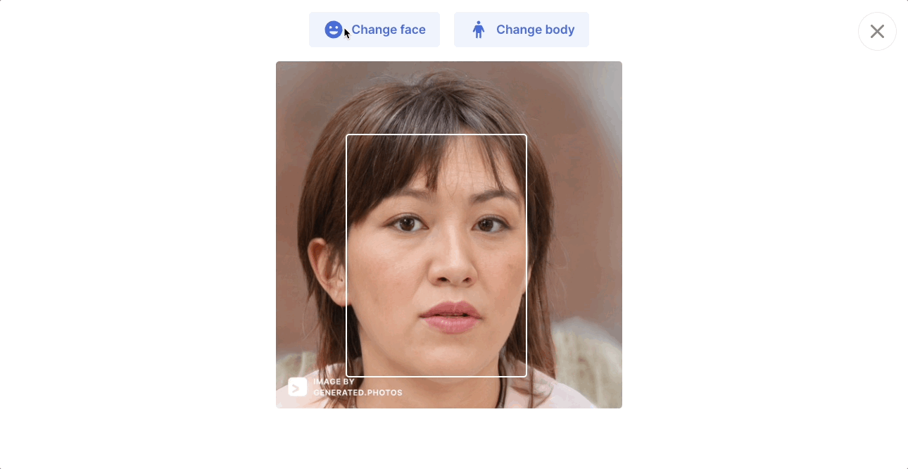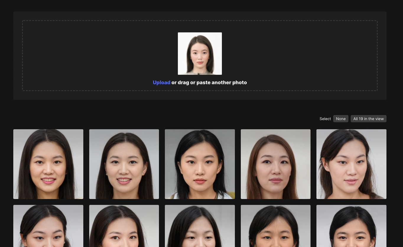 把照片拖進筐內,icons8自動幫妳生成一張「與你特色相近的臉」。例如範例中的臉部特徵為:黃白皮膚、深色頭髮、深色眼睛與稍微揚起得眉毛,AI幫我重新生成了這些臉部特徵與範例相近、卻又不相同的臉。