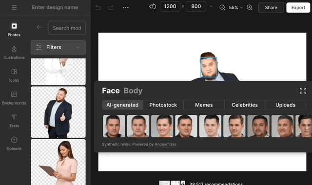 不只組圖,還可以丟圖片上去編輯,或是運用icons8內建圖庫裡的照片,同一組照片都有非常多姿勢、角度可以選擇,若系統偵測出臉部,也可以直接在此進行AI換臉,或與迷因的臉結合,做出一張獨一無二的相片。