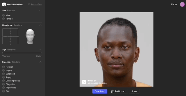 如果你覺得上面的圖書館很麻煩,想要認真看一張臉就好,那麼你可以來臉部生成器體驗看看。系統會在初始時隨機生成一張臉,接著再依照性別、臉部角度等選項調整,連頭髮長度都可以調整,還可以為這張臉戴上普通眼鏡或太陽眼鏡,就像一個臉部客製化機器。