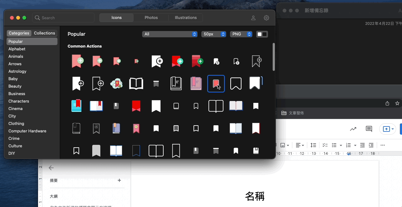 跟著官網步驟就可以簡單下載app,在任何需要的地方,不管線上或線下文件,只要一個拖拉的動作就可以使用,除了icon,照片、插畫也同樣適用。