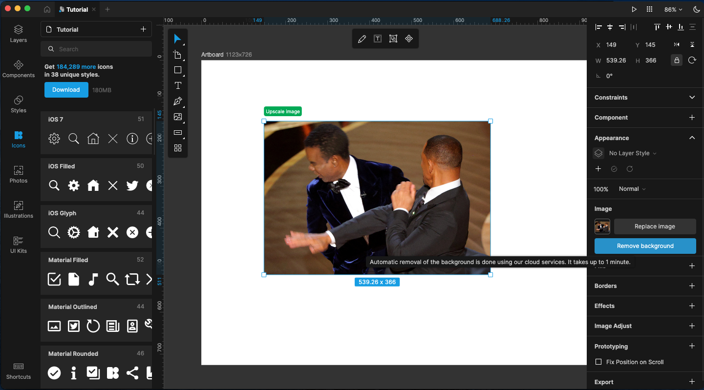 且上述的icons、相片資料庫他都有,可以在設計網站wireframe時,直接拉進AI人像,還可以直接拖曳照片去背、解析度銳化,也可以與其他使用者一起雲端協作,適合作為與客戶溝通用戶介面設計的工具。