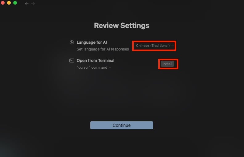再下一步,選擇您的慣用語言(不是程式語言),可以選繁體中文,AI 會用繁中與您對話。Terminal 啟動器可以先安裝起來,點擊 Install,這樣之後就能用 cursor 指令打開編輯器了。