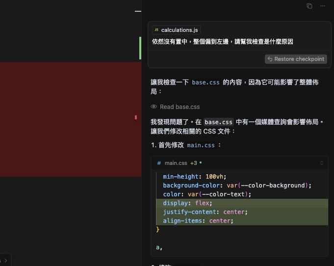 成功改顏色了,但是版面依然還是偏左。妳可以請 Cusor 嘗試自己抓原因,有時候可能會 2-3 次鬼打牆修不好,可以重複請他用不同的角度去檢查,例如是否是版面程式碼造成?是否是不相關的程式碼互相衝突等?或者請他移除預設代碼,自己重寫等等,讓他從不同角度檢視程式碼: