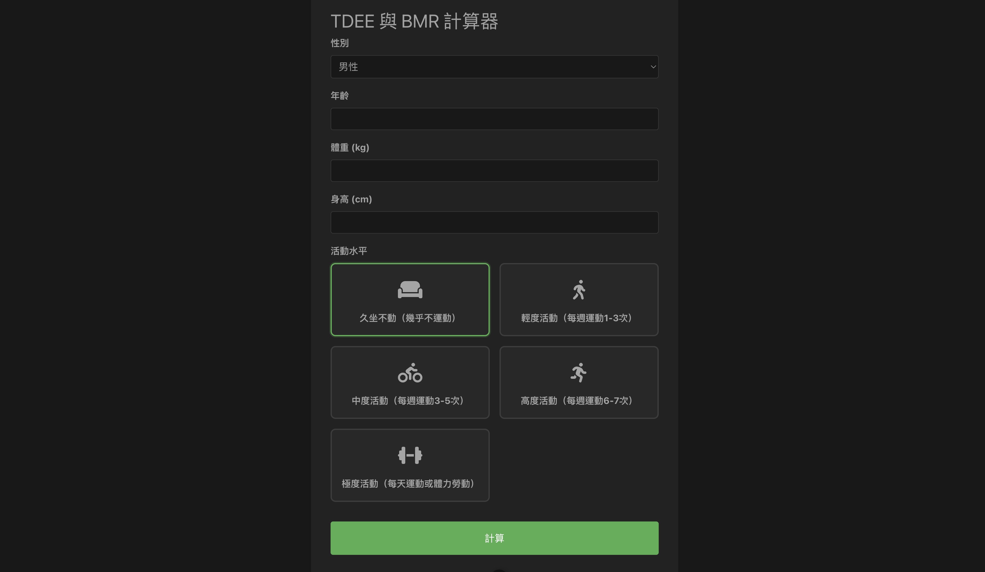 首先,這次的示範,我打算做一個簡單的卡路里計算機,可以計算每個人一天的基礎熱量(BMR)與總熱量(TDEE)數值。