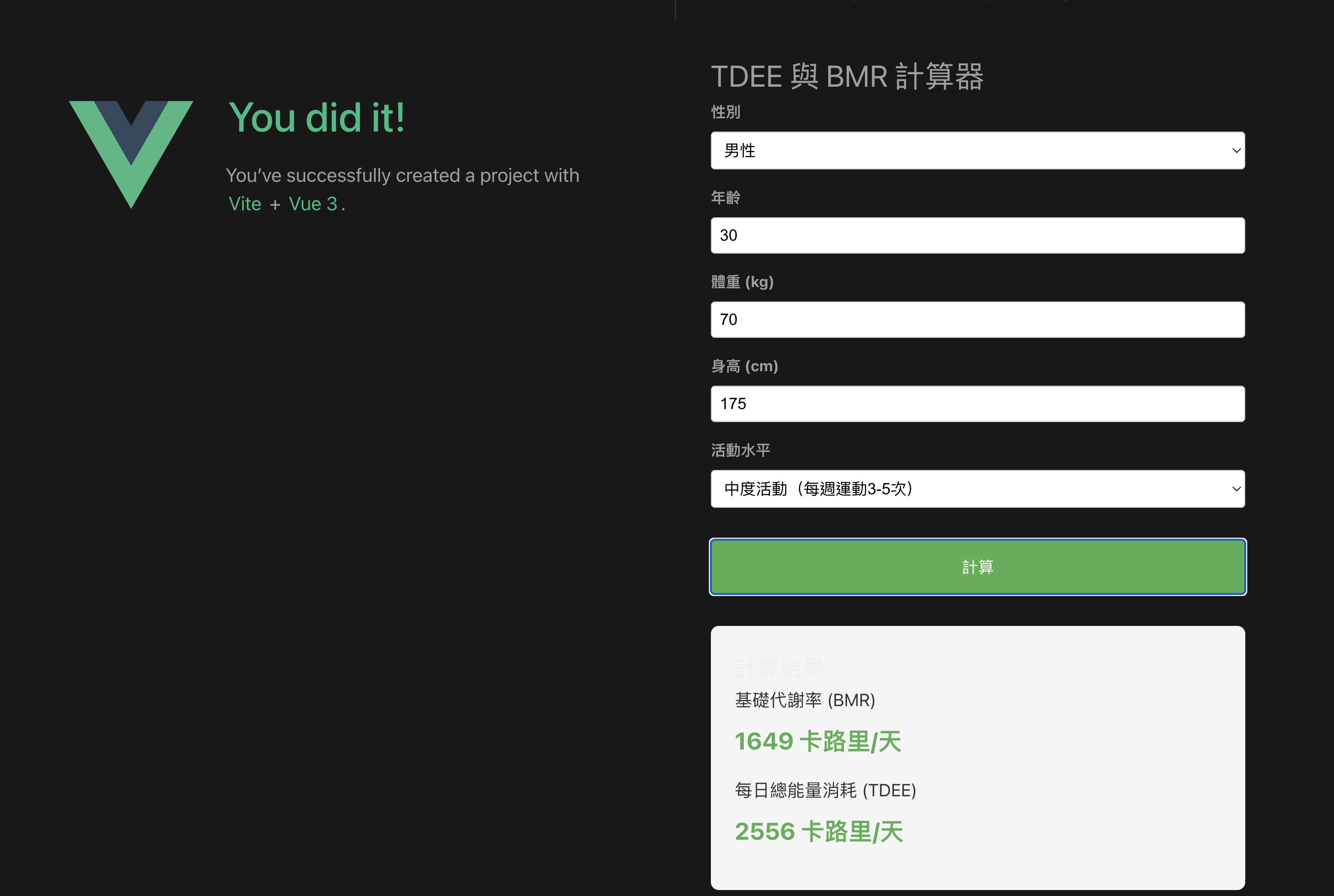 本文章夏格飛只用 Cursor + 口語化指令進行程式開發,不親手調整程式碼。預計製作一個簡單的卡路里計算器,可以藉由輸入身高、年齡與運動頻率等問題,計算出對應的基礎熱量消耗(BMR)與每日總熱量(TDEE)。下圖是最終成果。