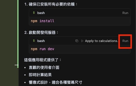 Cursor 會問你想要做什麼?用哪種程式語言?什麼工具之類的問題,一旦確定後,就會產生指令問你要不要執行,點擊 Run 就會開始。