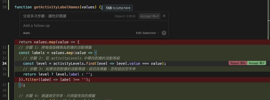 也可以圈選一段程式碼做修改,他會顯示改變的對比,同樣按下 Accept 就會套用