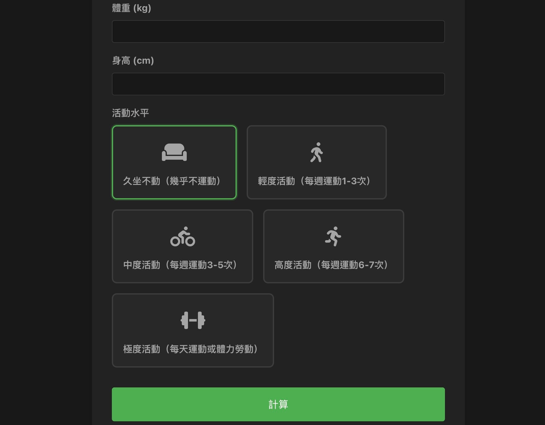 我們可以看到一個計算器出現,並且可以輸入數值然後計算熱量消耗率,這樣就算完成很基礎的第一步了。