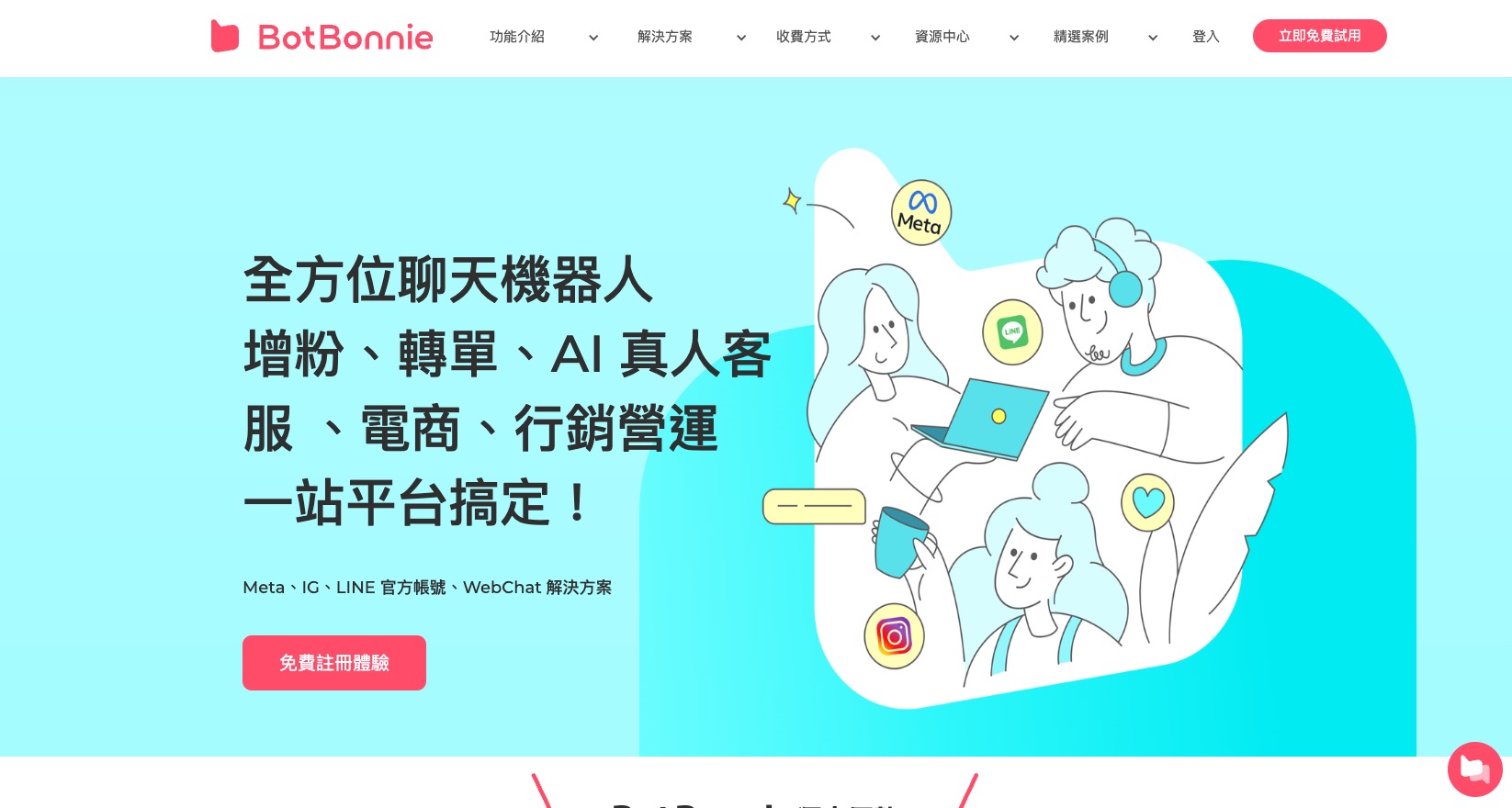 BotBonnie基本版、標準版、電商版、企業版NT$1,999~10,000/月 (有免費方案)月繳,依訂閱人數計費提供多種行銷模組,支援 LINE、FB、IG 等平台。