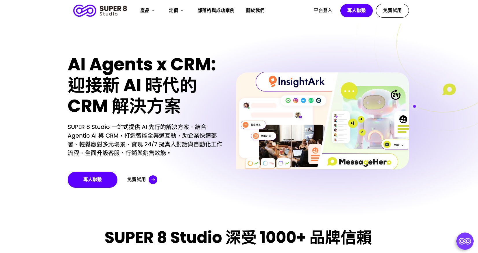 Super 8 - InsightArk入門客服、進階行銷、專業 MarTechNT$2,500~8,500/月年繳或月繳,依需求客製化支援多平台整合,提供 AI 助手、自動化行銷等功能。